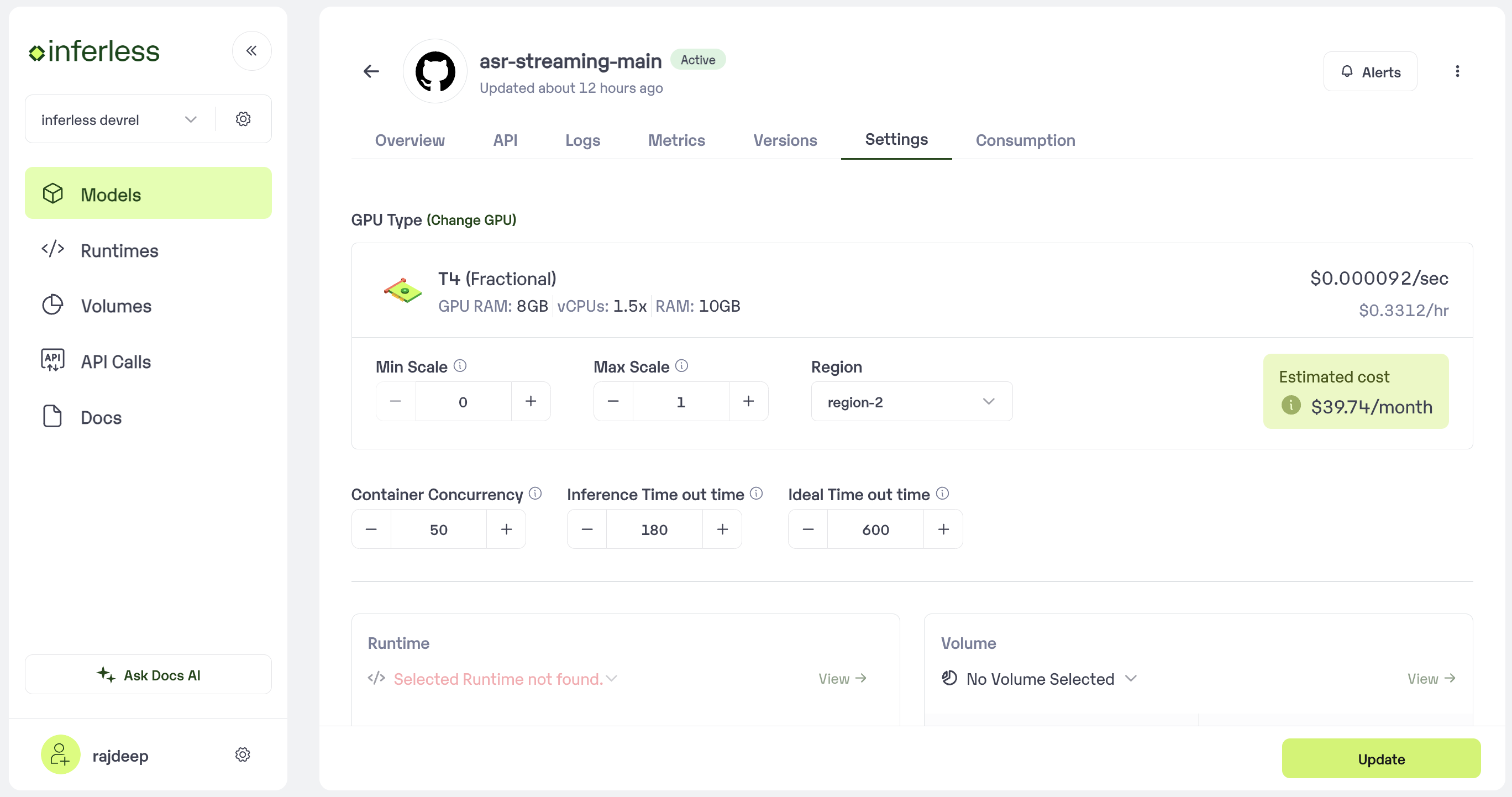 - Navigate to Model Settings: Look for the settings or configuration section where you can find options for Scale Down, Inference Timeouts, and Container Concurrency.