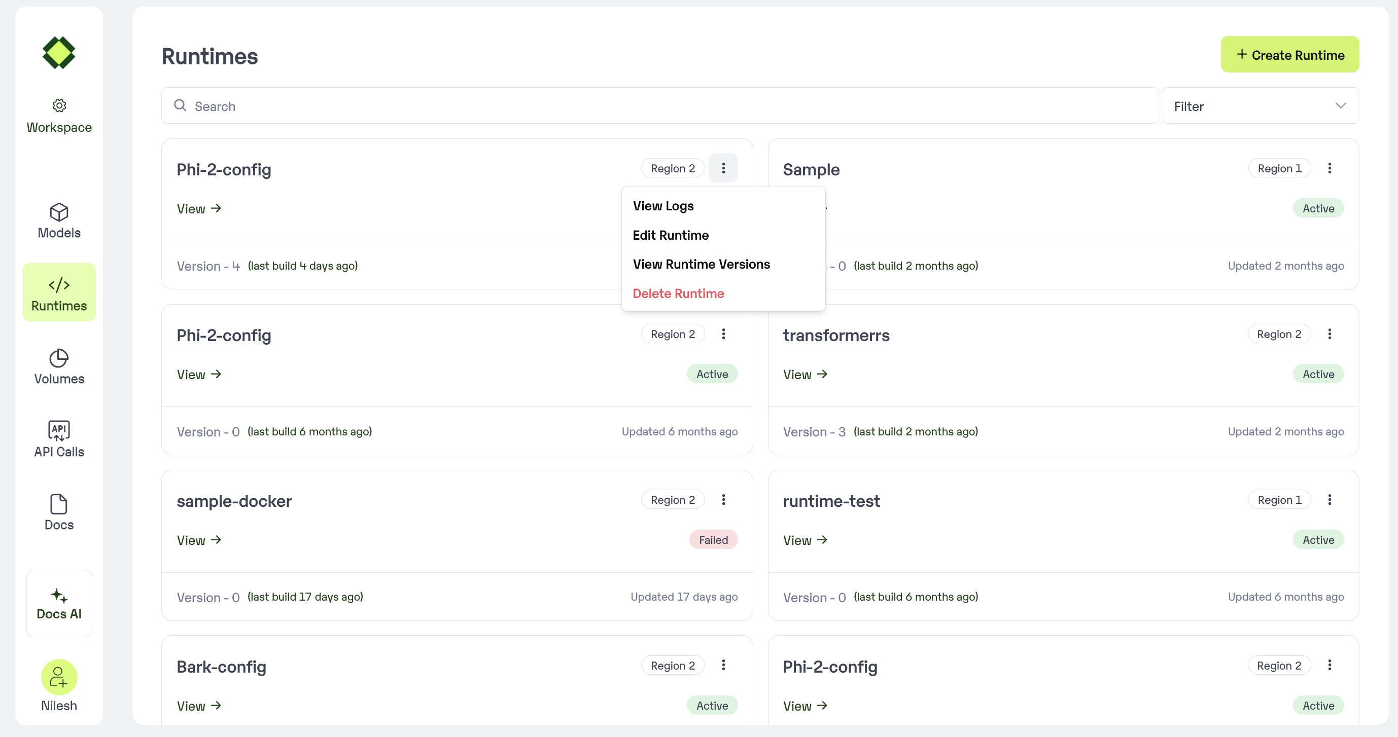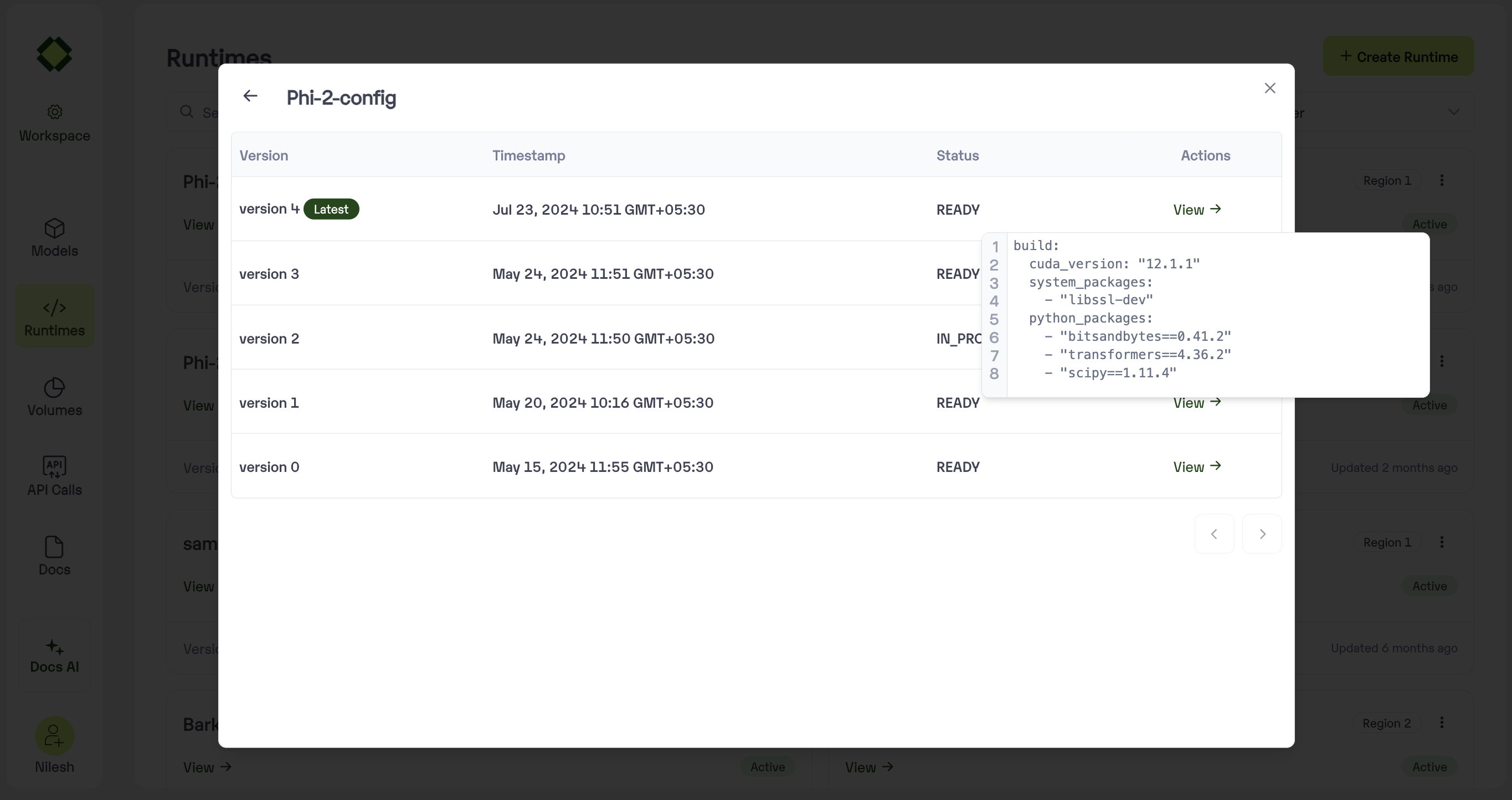 You can edit the runtime in UI or patch the runtime using CLI to create a new version of the runtime. All your models will remain in the older version you previously deployed with unless you explicitly update them in Model Settings. You can see all the versions of the runtime by clicking the ‘View Runtime Versions’.