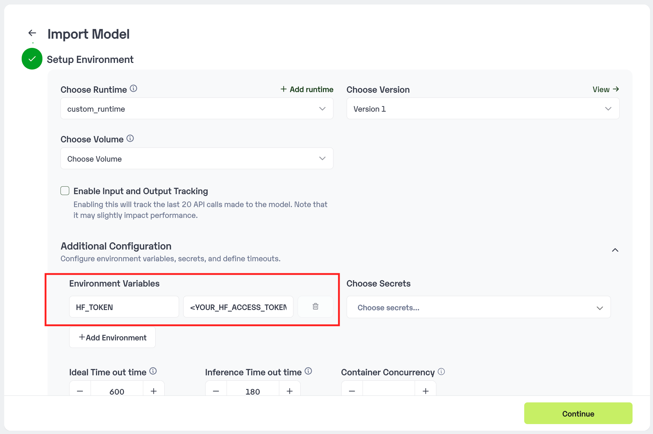 - If you’re deploying a model from Hugging Face that requires authentication, set your Hugging Face access token as an environment variable named