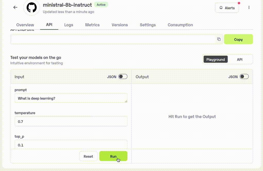 To deploy the model using Inferless CLI, execute the following command:--gpu A100: Specifies the GPU type for deployment. Available options includeA10,A100, andT4.--runtime inferless-runtime-config.yaml: Defines the runtime configuration file. If not specified, the default Inferless runtime is used.