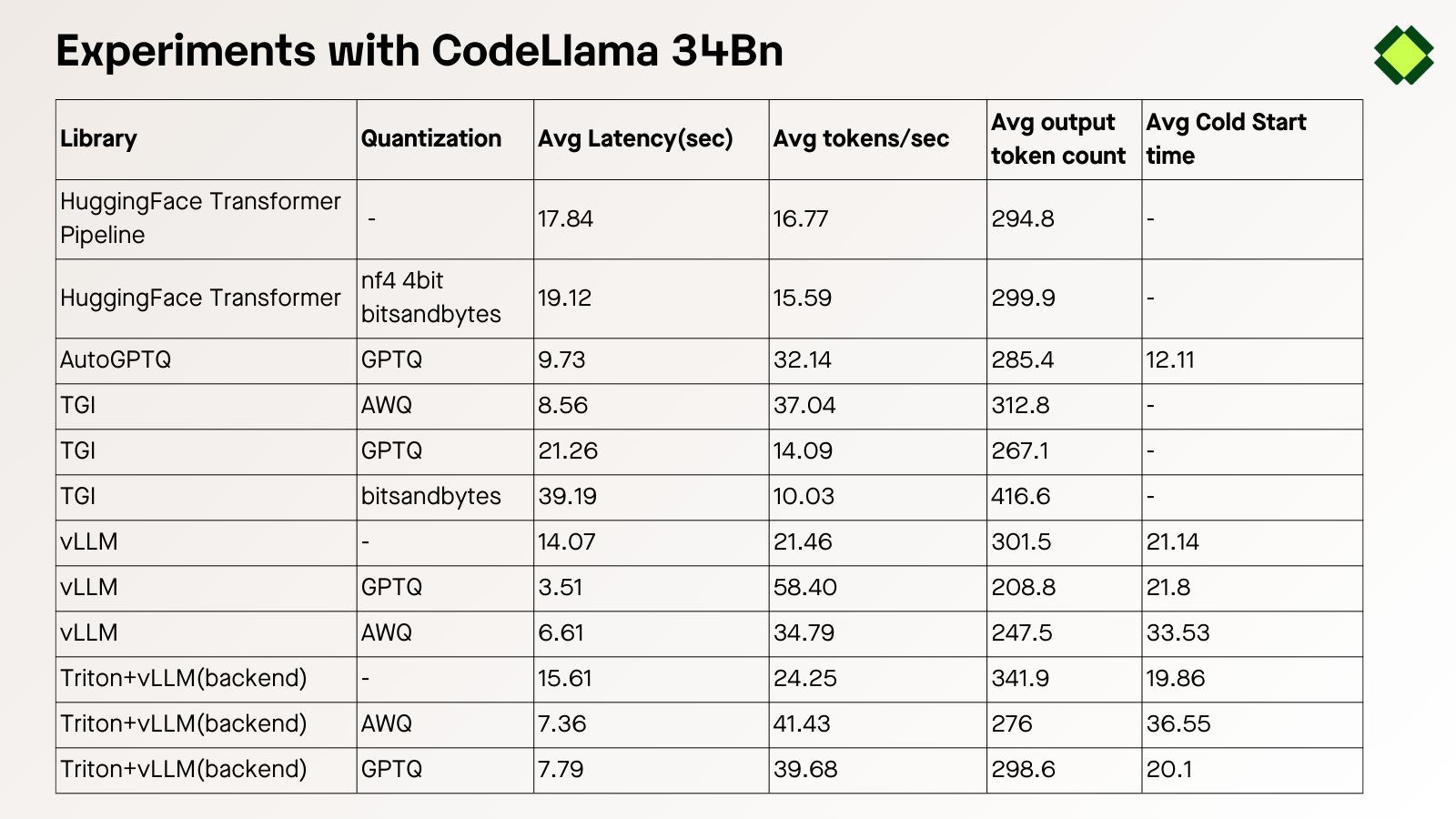 We have considered using 4 different inference libraries and tested the CodeLlama-34b-Python model with a max_token of 512, with the default configuration of all the inference libraries.- Hugging Face: Transformer provides an easy-to-use pipeline for quick deployment of LLM but is not a good choice for LLM inference. We have used BitsandBytes with 4bit quantization, however it didn’t help in improving the inference latency.