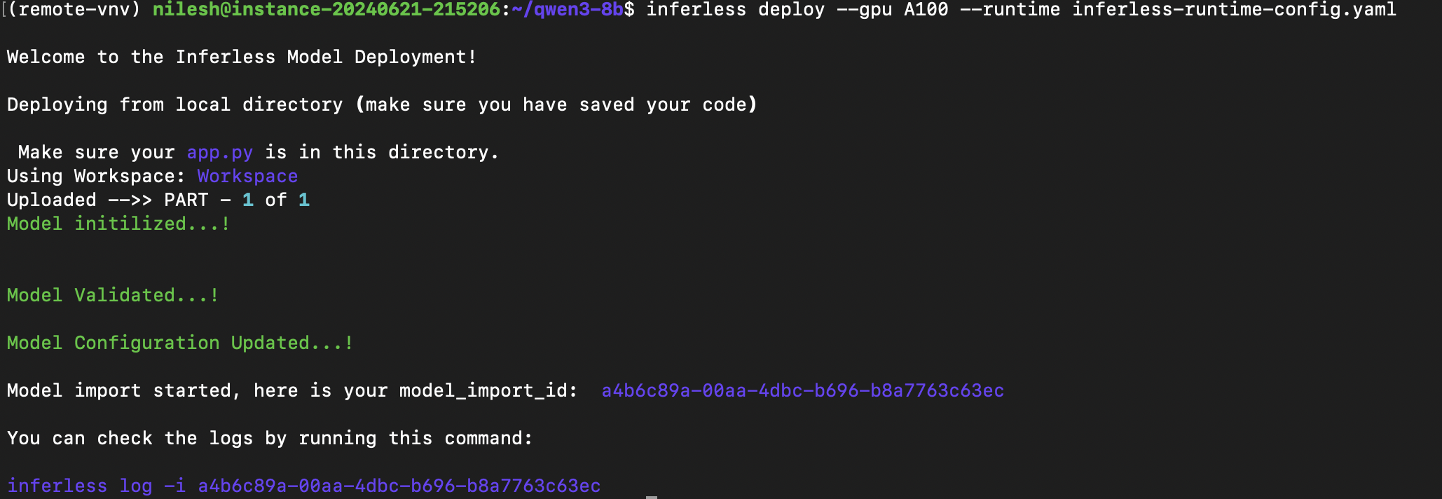 To deploy the model using Inferless CLI, execute the following command:--gpu A100: Specifies the GPU type for deployment. Available options includeA10,A100, andT4.--runtime inferless-runtime-config.yaml: Defines the runtime configuration file. If not specified, the default Inferless runtime is used.