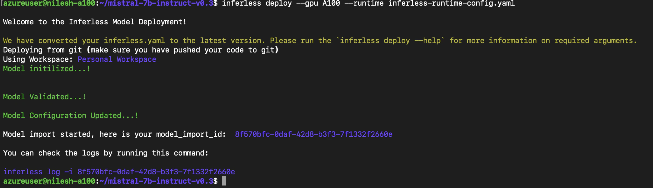 To deploy the model using Inferless CLI, execute the following command:--gpu A100: Specifies the GPU type for deployment. Available options includeA10,A100, andT4.--runtime inferless-runtime-config.yaml: Defines the runtime configuration file. If not specified, the default Inferless runtime is used.