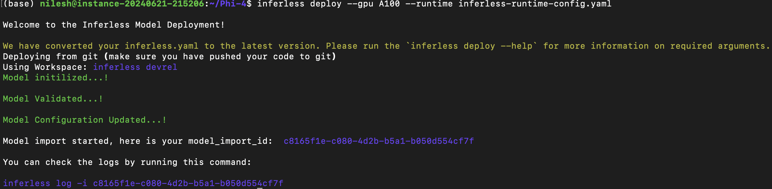 To deploy the model using Inferless CLI, execute the following command:--gpu A100: Specifies the GPU type for deployment. Available options includeA10,A100, andT4.--runtime inferless-runtime-config.yaml: Defines the runtime configuration file. If not specified, the default Inferless runtime is used.