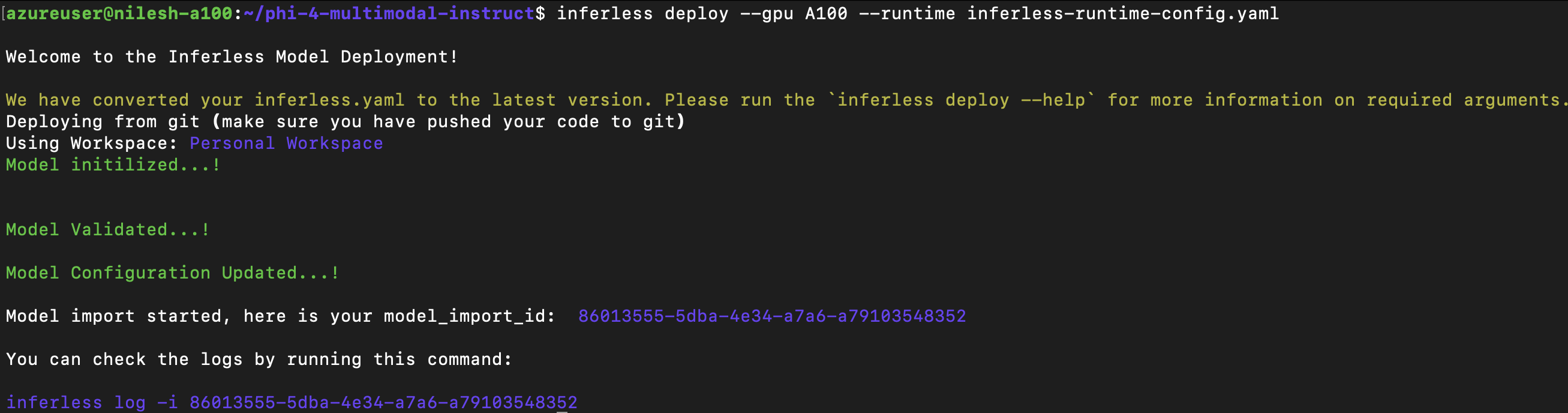 To deploy the model using Inferless CLI, execute the following command:--gpu A100: Specifies the GPU type for deployment. Available options includeA10,A100, andT4.--runtime inferless-runtime-config.yaml: Defines the runtime configuration file. If not specified, the default Inferless runtime is used.