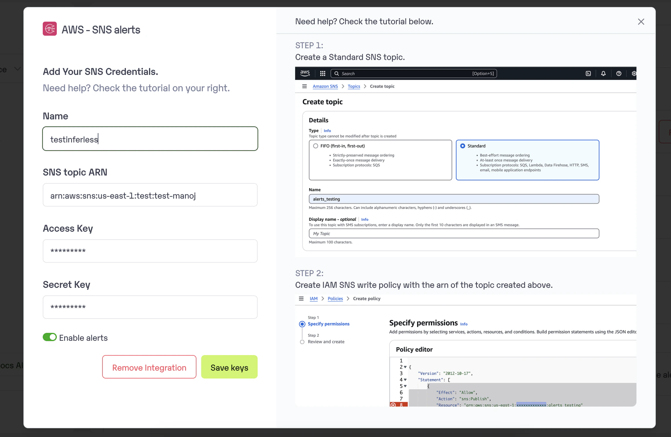 Add the topic ARN, access and secret keys in the Manage Integrations —> Workspace Integrations —> AWS SNS section