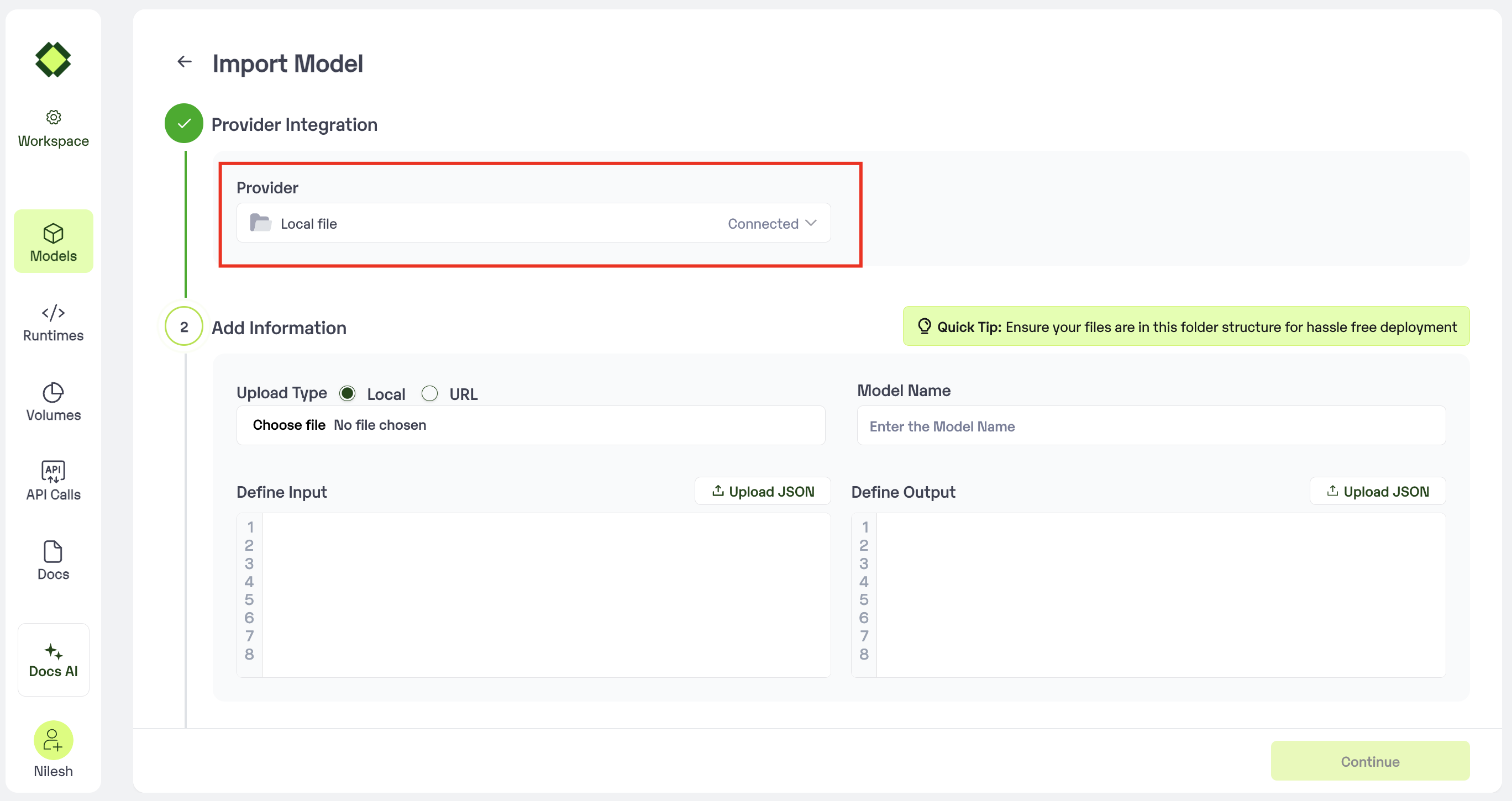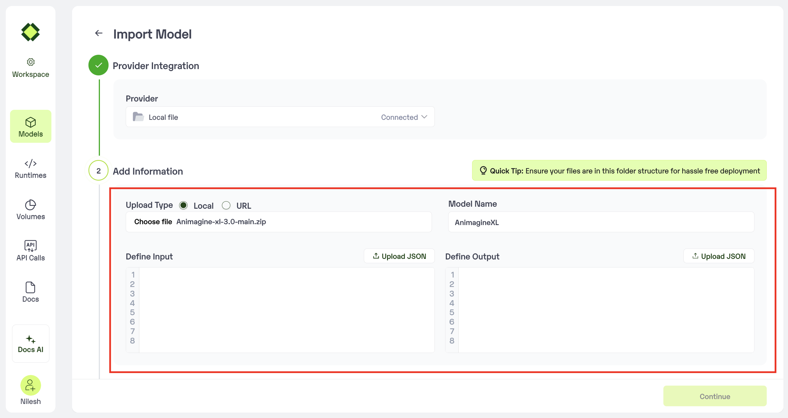 Local Fileas the method of upload. - Make sure that the model file is stored in a .zip format and has the file structure as mentioned here