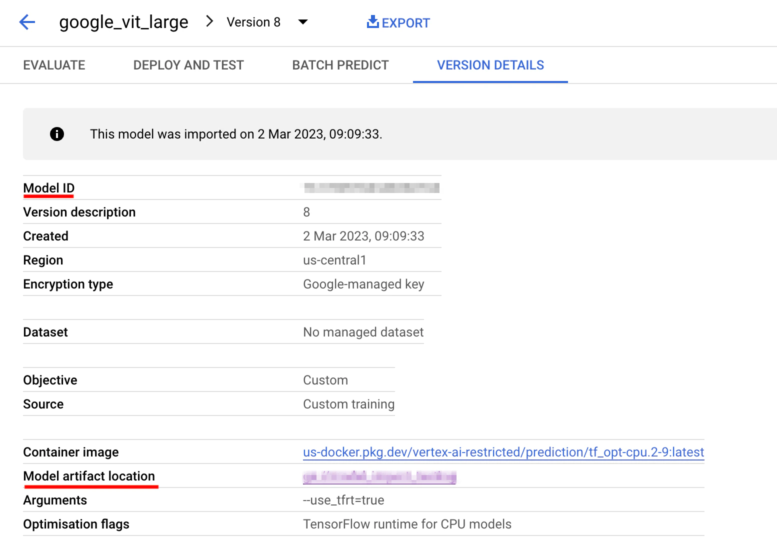 - You would need to note down the Model ID, and Model Artifact details from GCS.
