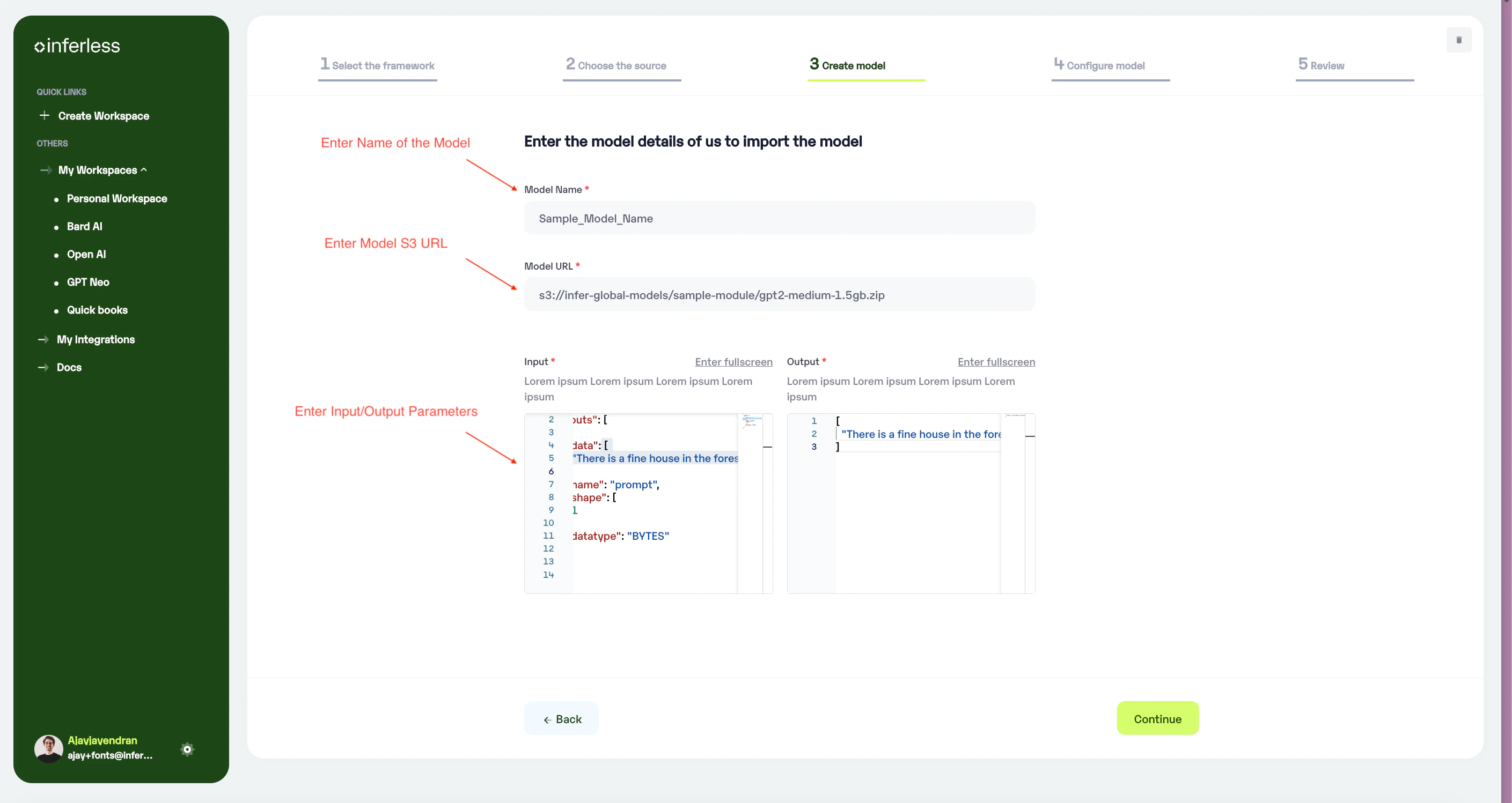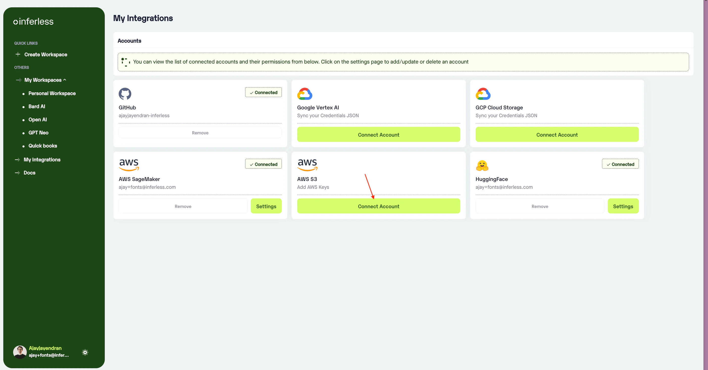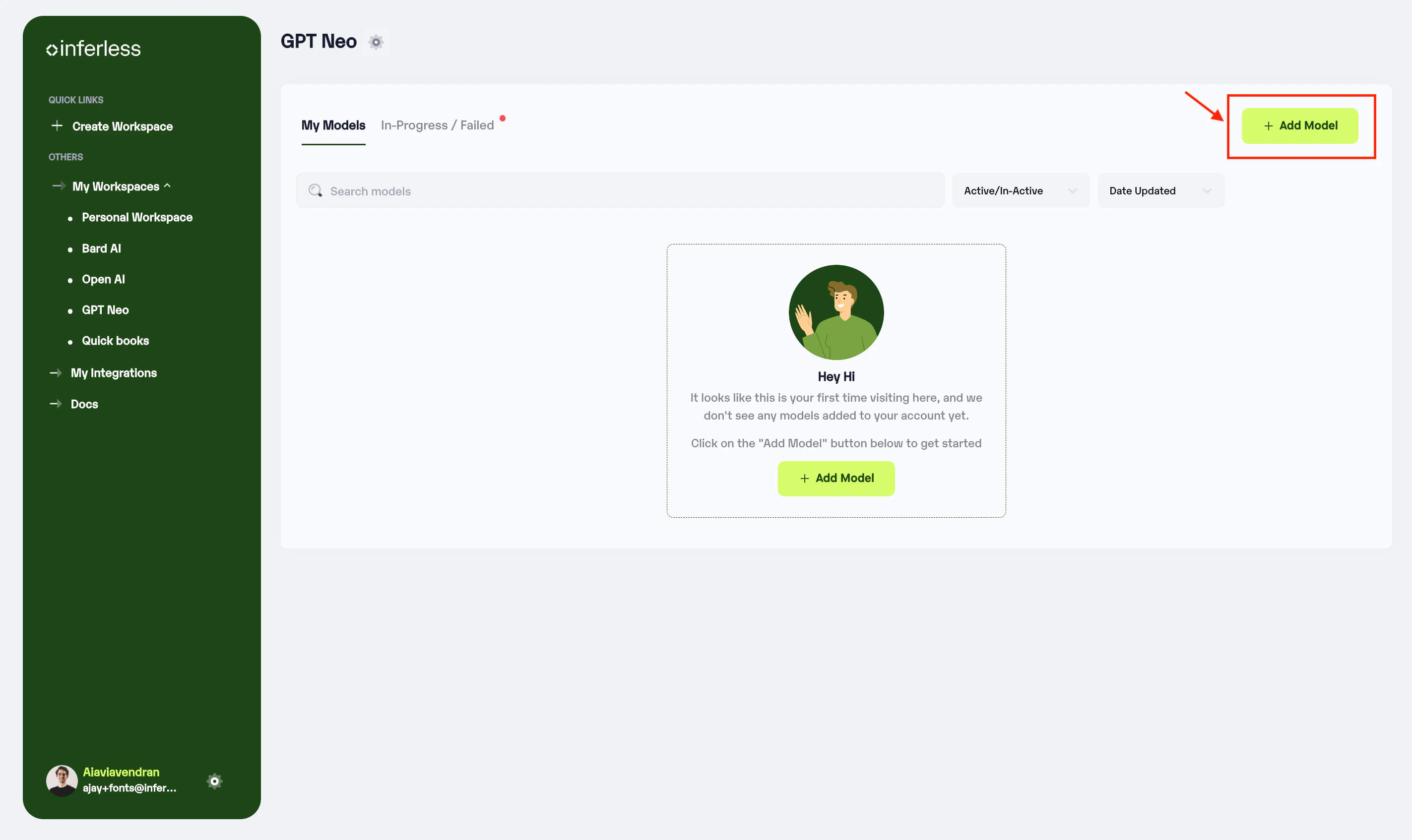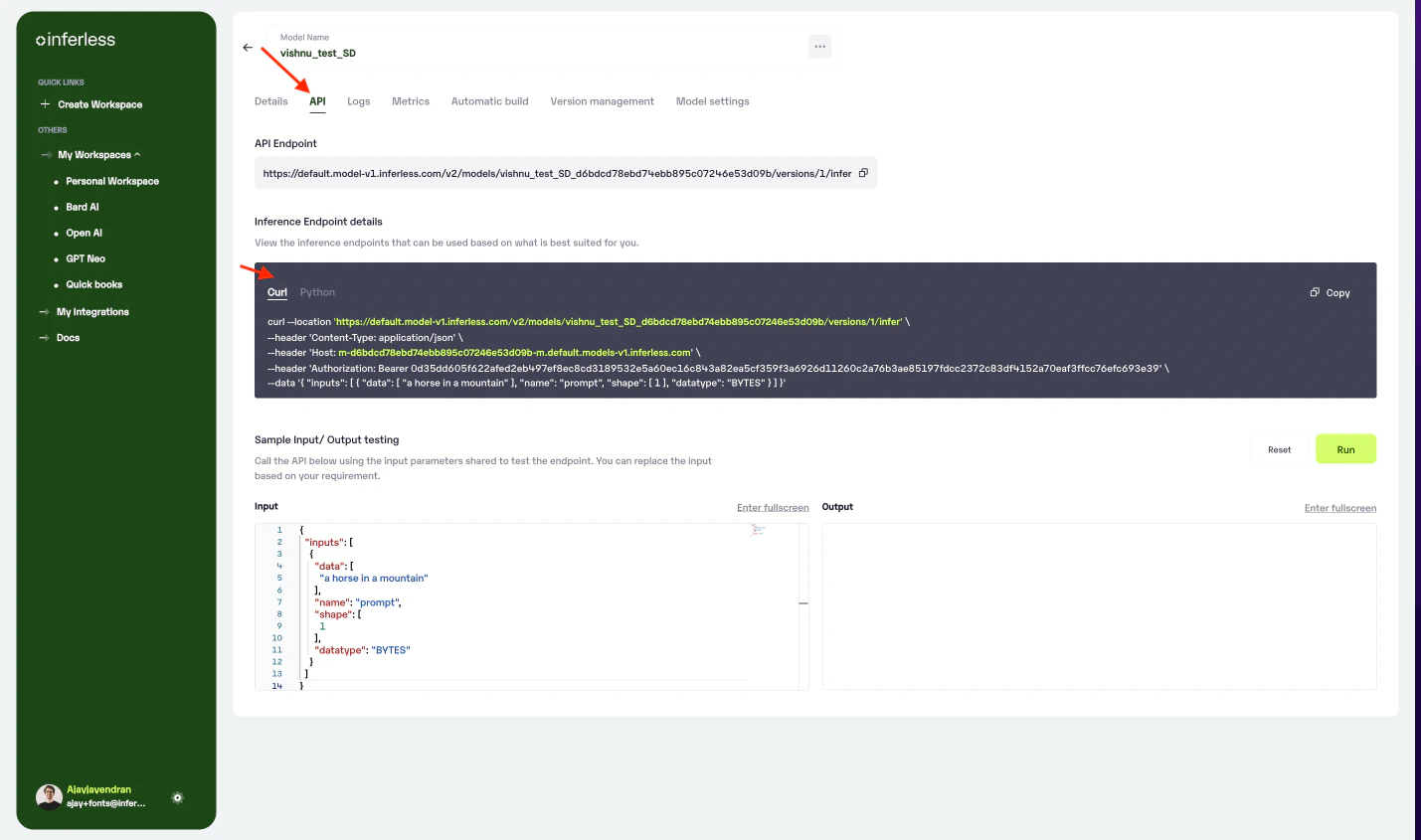 - Navigate to your desired workspace in Inferless and Click on