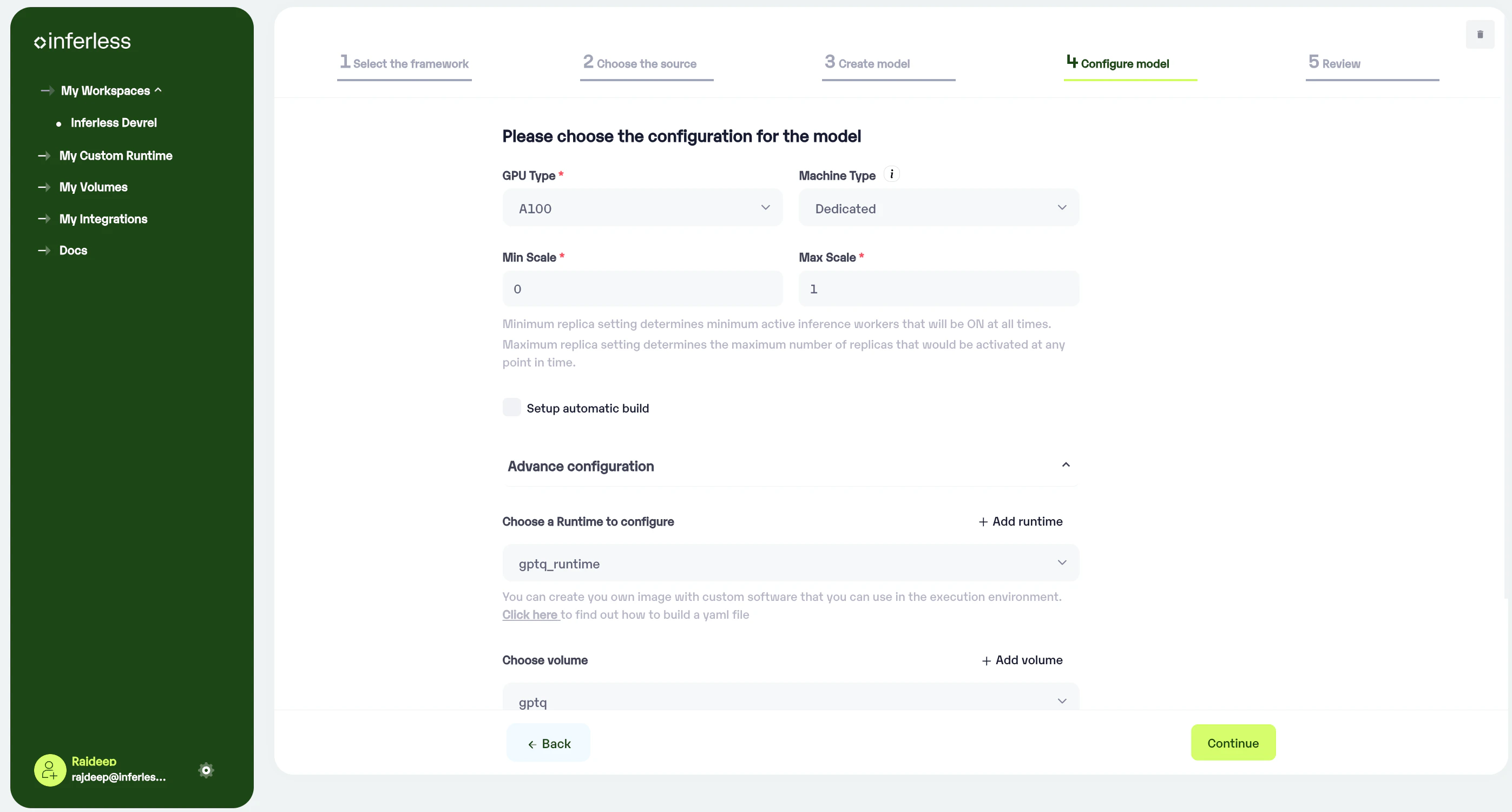 Volume allows you to store the model files on NFS-like writeable volumes, which can store model parameters to help with cold start. Click on the Add volume to create a volume and select it from the dropdown menu.