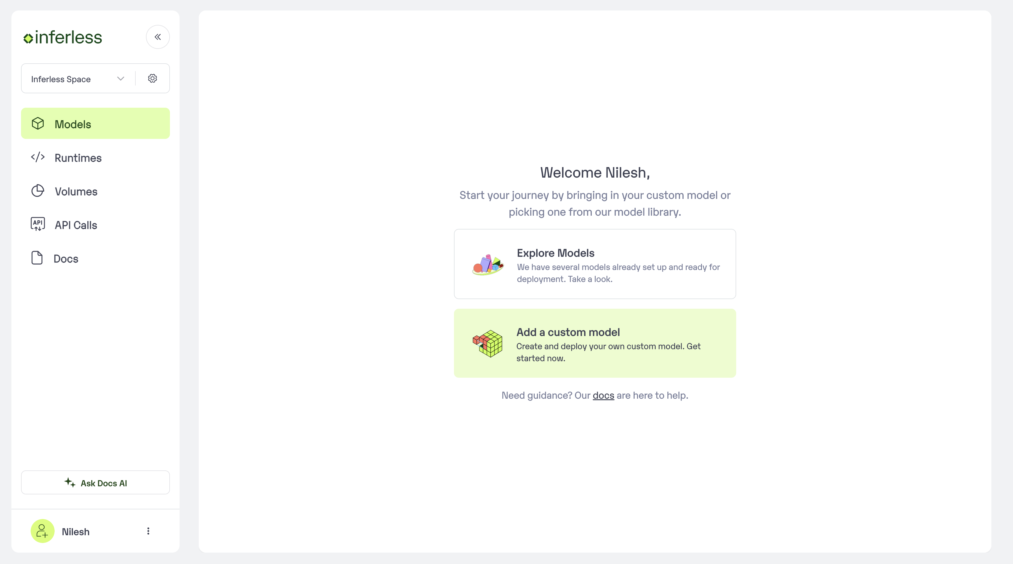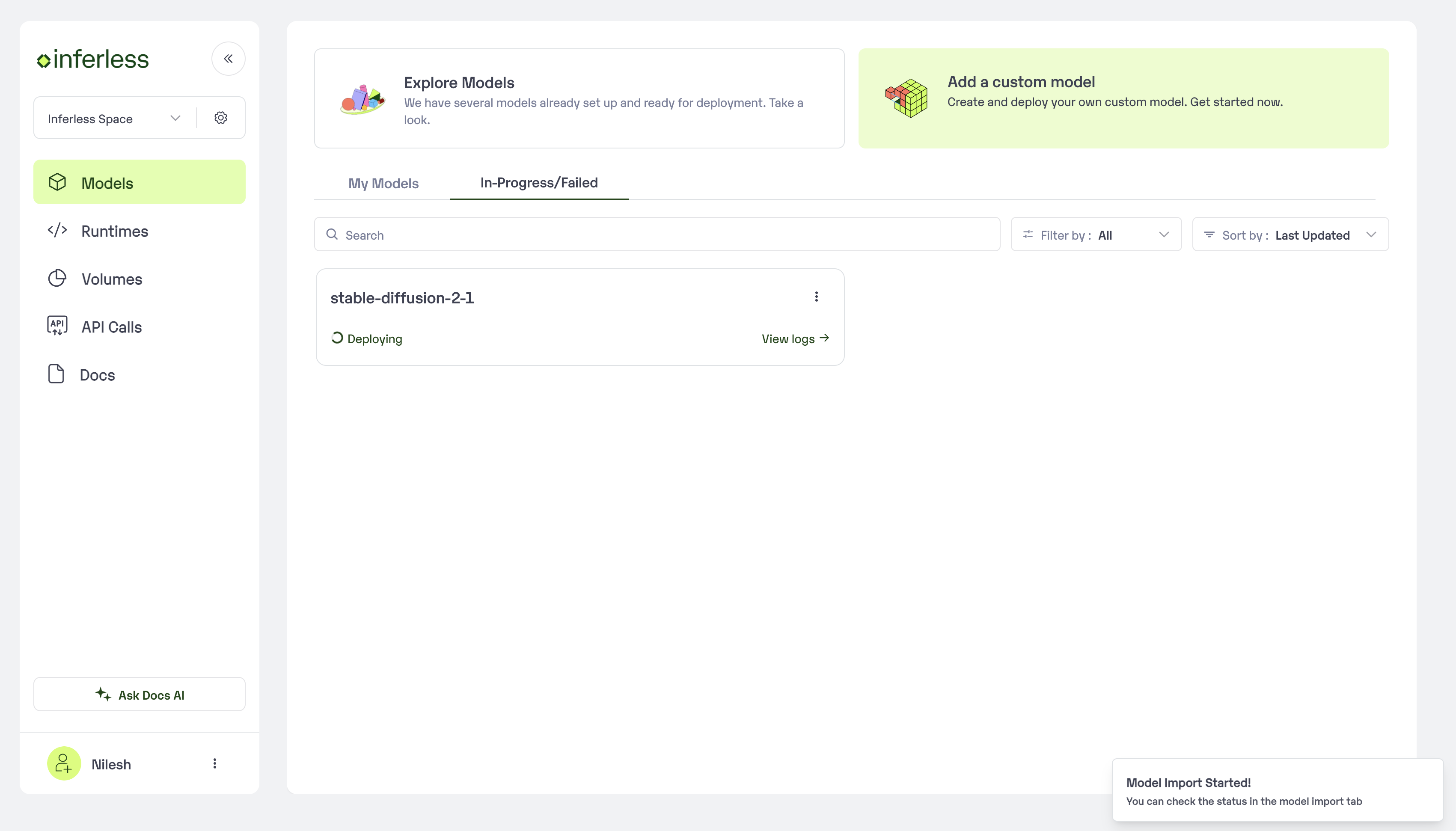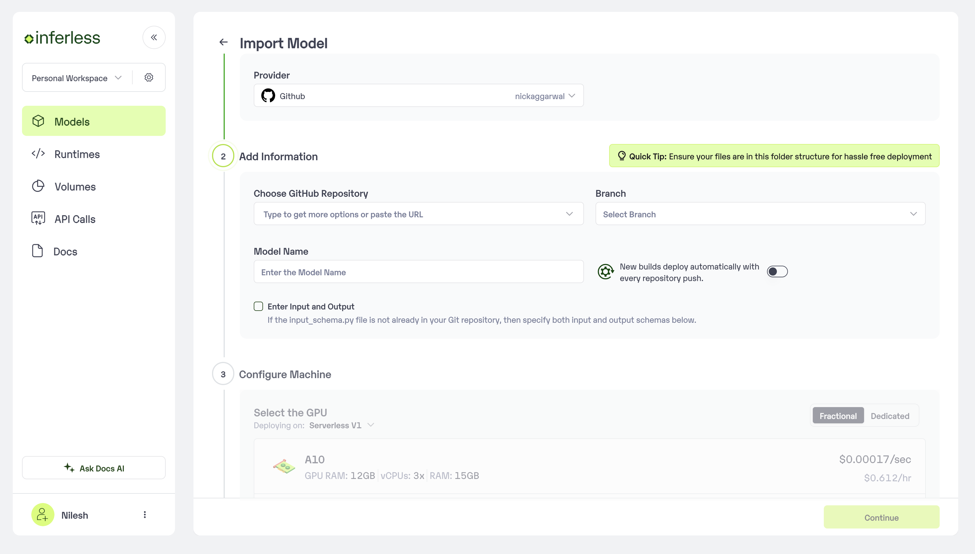 We have created a Template repository that you can use as a base to inject your code you can find a sample here with the GPT Neo model. Github Repo: https://github.com/inferless/templateStep 2: Login to the Inferless dashboard and Select Github