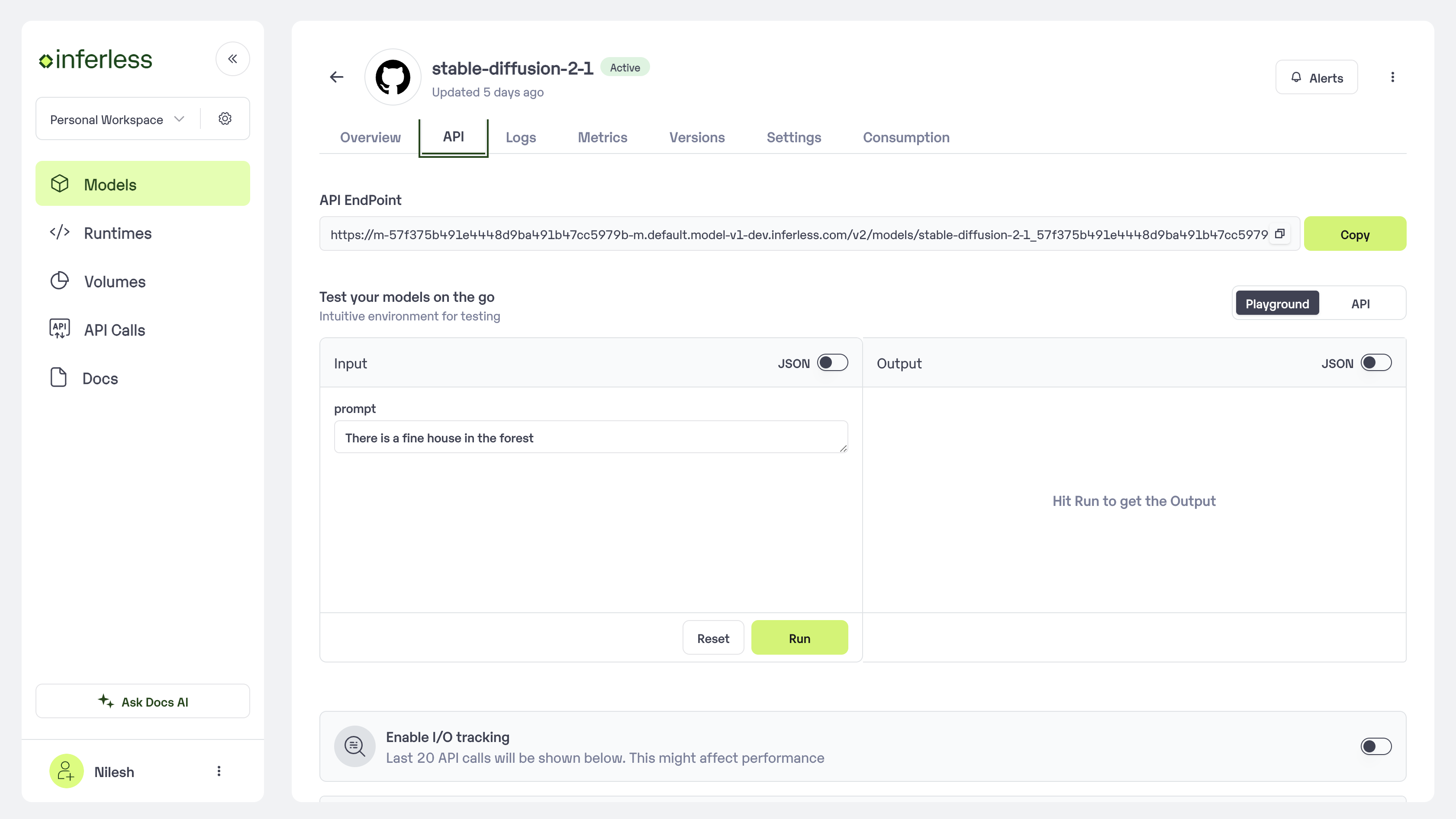 Once the model is in ‘Active’ status you can click on the ‘API’ page to try the model with sample inputs.